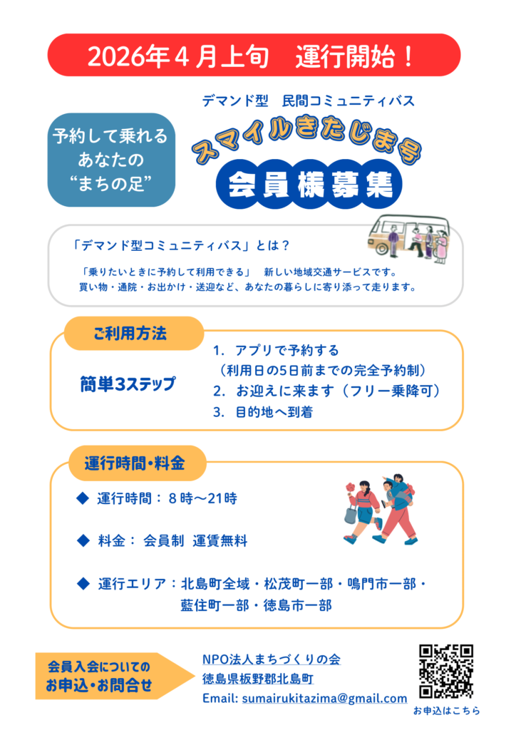徳島県板野郡北島町で初めてとなる、完全民間運営のデマンド型コミュニティバス「スマイルきたじま号」が、いよいよ 2026年4月上旬に運行を開始いたします。 子供の送迎、病院までの移動、子どもを連れての移動、そんな日常の“ちょっと困った”を、地域の力で解決したい その想いから生まれたのが、スマイルきたじま号です。